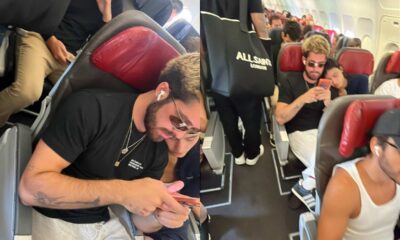 Em um dos registros, a mulher de João também aparece mexendo no celular, acompanhando o ator em seu momento de lazer durante o voo