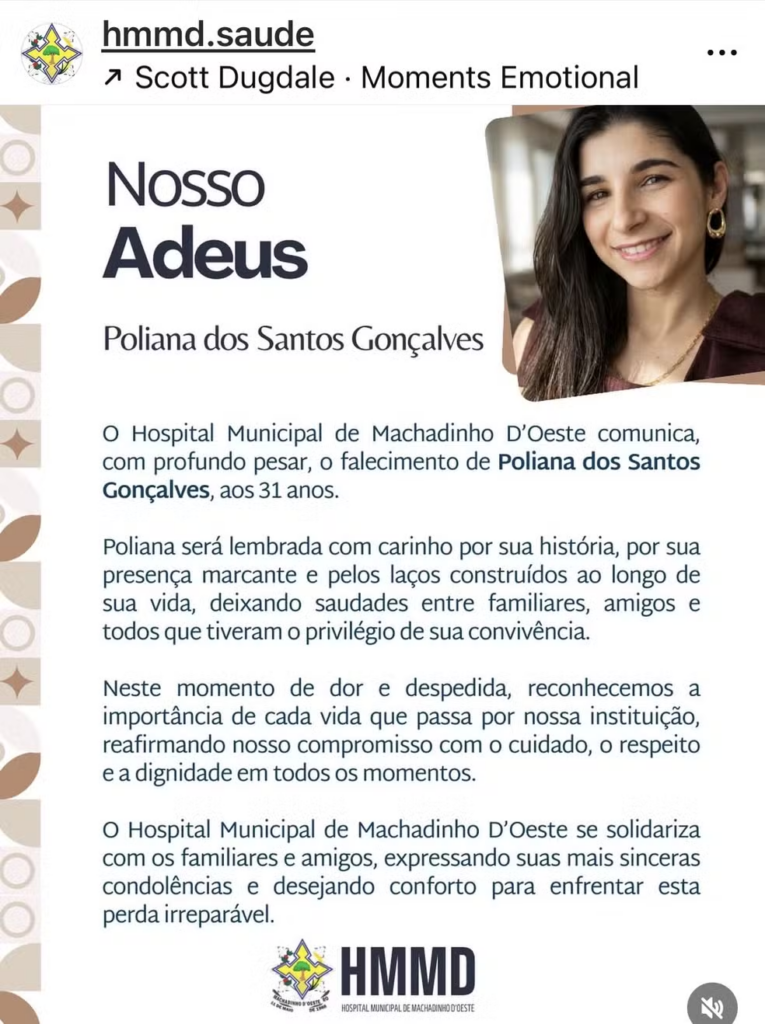 Uma mulher de 31 anos, Poliana Santos Gonçalves, foi encontrada morta dentro de sua casa em Machadinho D’Oeste (RO) na terça-feira (18). O corpo apresentava sinais de violência, com mãos e pernas amarradas, olhos vendados e várias perfurações causadas por um objeto cortante.