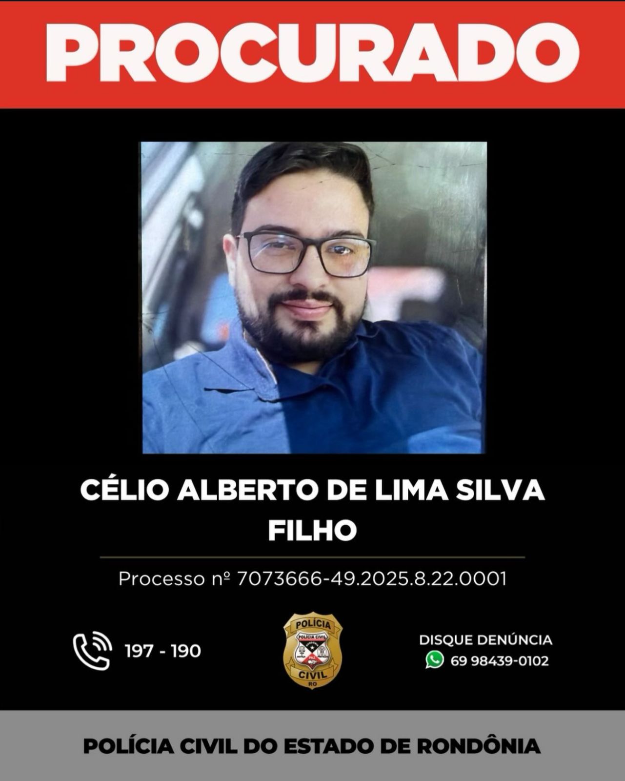 A Polícia Civil de Rondônia informou, nesta segunda-feira (08), que Célio Alberto de Lima Silva Filho, apontado como o mandante das duas tentativas de homicídio contra o próprio pai durante a Operação Cronos, agora é considerado foragido da Justiça. O suspeito não foi localizado após a expedição do mandado de prisão e segue sendo procurado pelas equipes da Delegacia Especializada na Repressão a Extorsões, Roubos e Furtos (DERF).