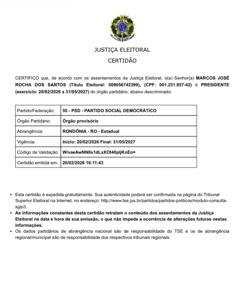 O governador de Rondônia, Marcos Rocha, foi oficialmente filiado ao Partido Social Democrático (PSD), conforme certidão emitida pela Justiça Eleitoral nesta quinta-feira (19 de fevereiro de 2026). O documento confirma que Marcos Rocha assume o cargo de presidente do diretório estadual provisório do PSD, com mandato que vai de 20 de fevereiro de 2026 até 31 de maio de 2027.