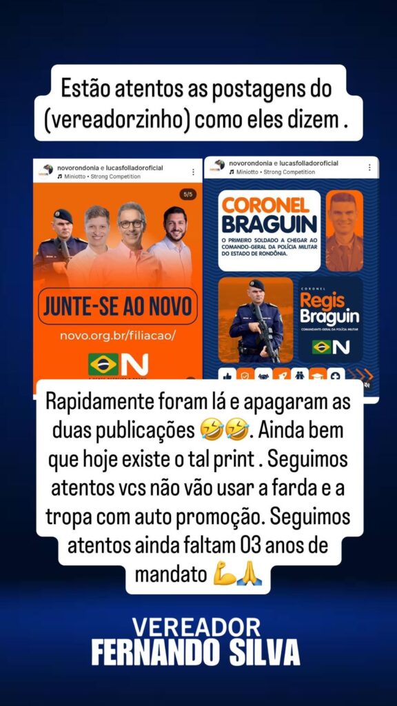 De acordo com Fernando Silva, o uso da farda para autopromoção é ilegal e um desrespeito tanto à população quanto aos próprios militares. “A farda não é para ser usada como santinho ou bandeira de partido. Ela representa compromisso com a lei, e não com um projeto político”, afirmou o vereador em suas redes sociais. Silva também destacou que, apesar das publicações terem sido apagadas rapidamente, ele conseguiu registrar prints das postagens antes que fossem excluídas.